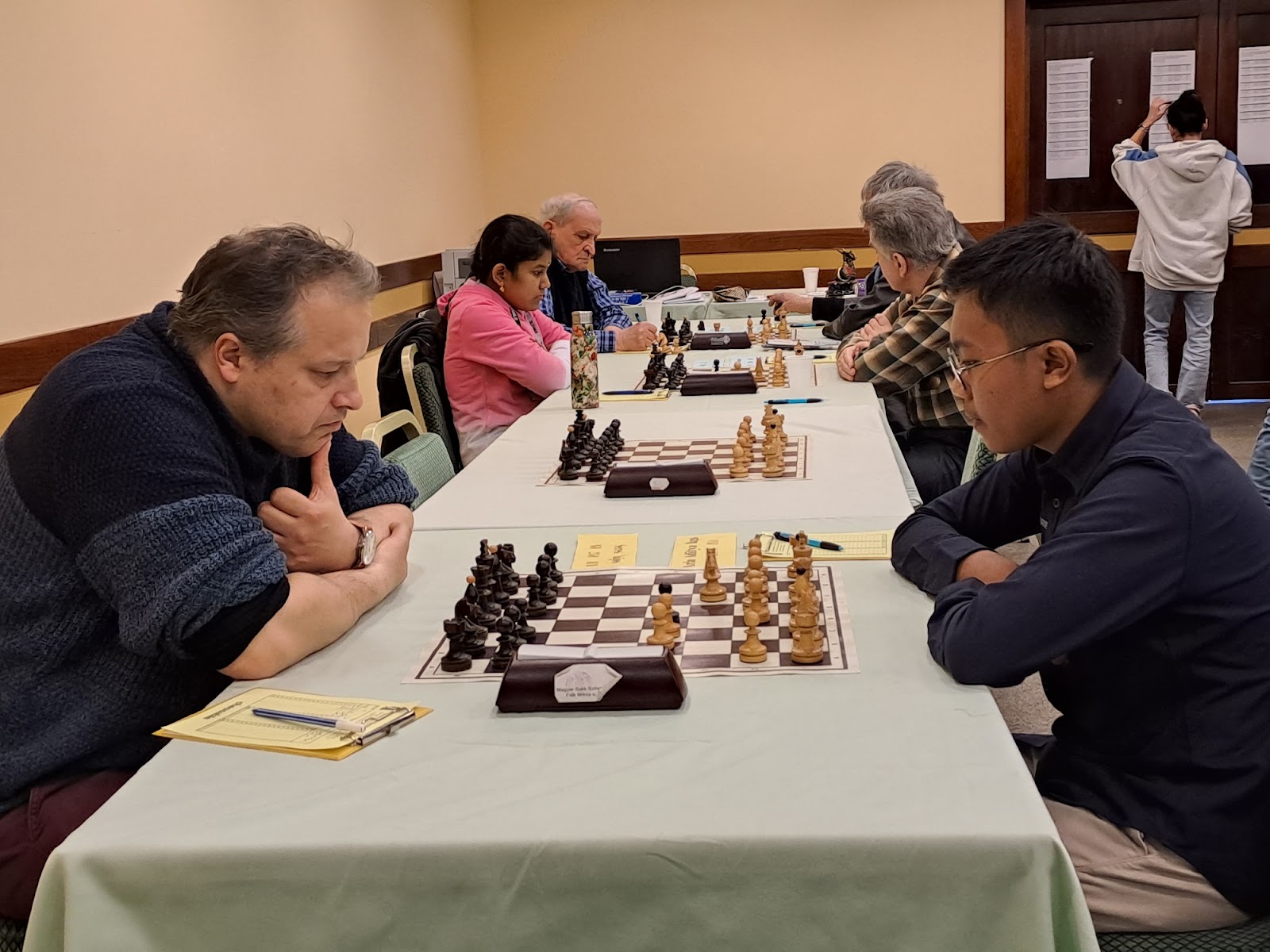 Adit (kanan) vs GM Lajos Seres, babak 9 First Saturday Maret 2023 (Foto Kristianus Liem)